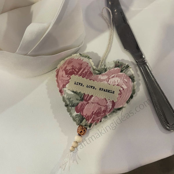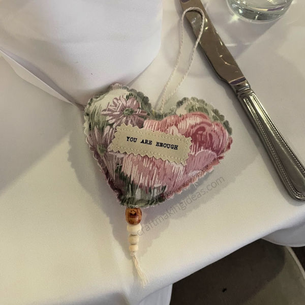 An individual hanging fabric heart, with beads, with choice of motivational message.
